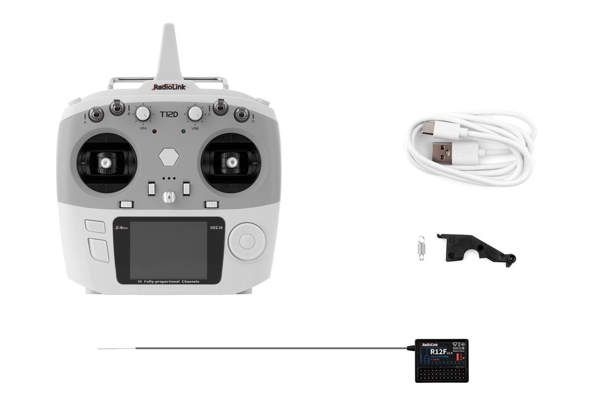Télécommande 12 canaux RadioLink T12D avec récepteur R12F – Émetteur compact et polyvalent pour les applications aériennes, terrestres et maritimes.