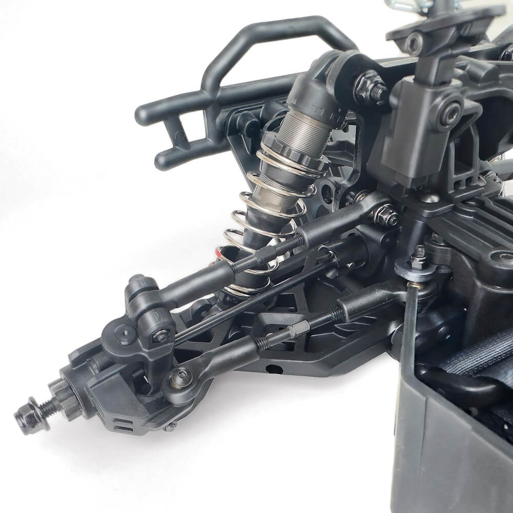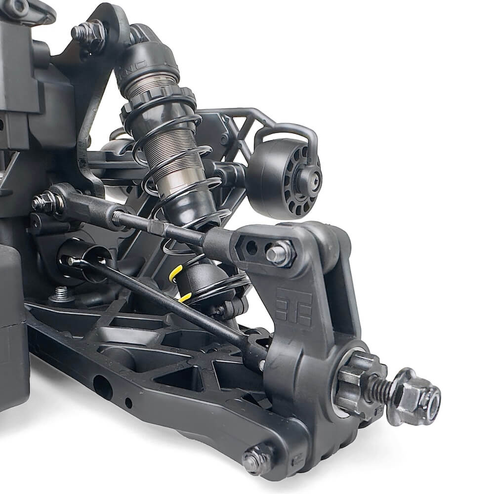 Bei der Entwicklung lag der Fokus klar auf Haltbarkeit und Antriebskraft. Viele Komponenten aus 7075-Aluminium, gehärtetem Stahl und hochfestem Nylon, die bei anderen Herstellern nur als Tuningteile erhältlich sind, gehören hier bereits zur Serienausstattung. Das Resultat ist ein extrem widerstandsfähiges Chassis, das selbst härteste Bash-Sessions souverän meistert.